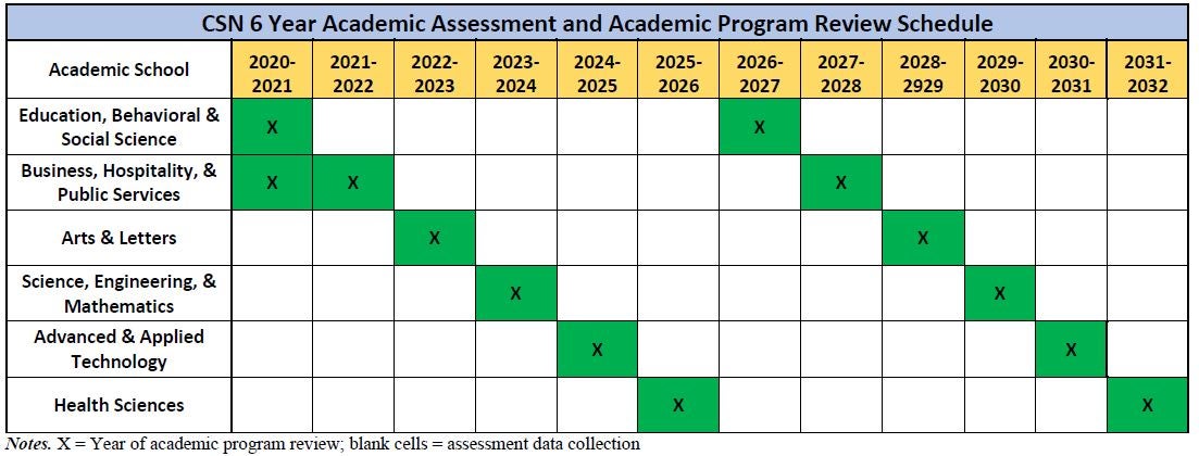 CSN has implemented unit planning for all executive, institutional support, student support, academic support, and academic units (Schools and Departments).  Unit planning components consist of a unit mission, SMART goals, strategies, effectiveness measures, and action items.  Unit planning is updated annually and modified as necessary, based on assessment evidence from the previous academic year.  The planning and reporting timeline below should be followed with an annual reporting due date of November 1 for data collected the previous fiscal year.