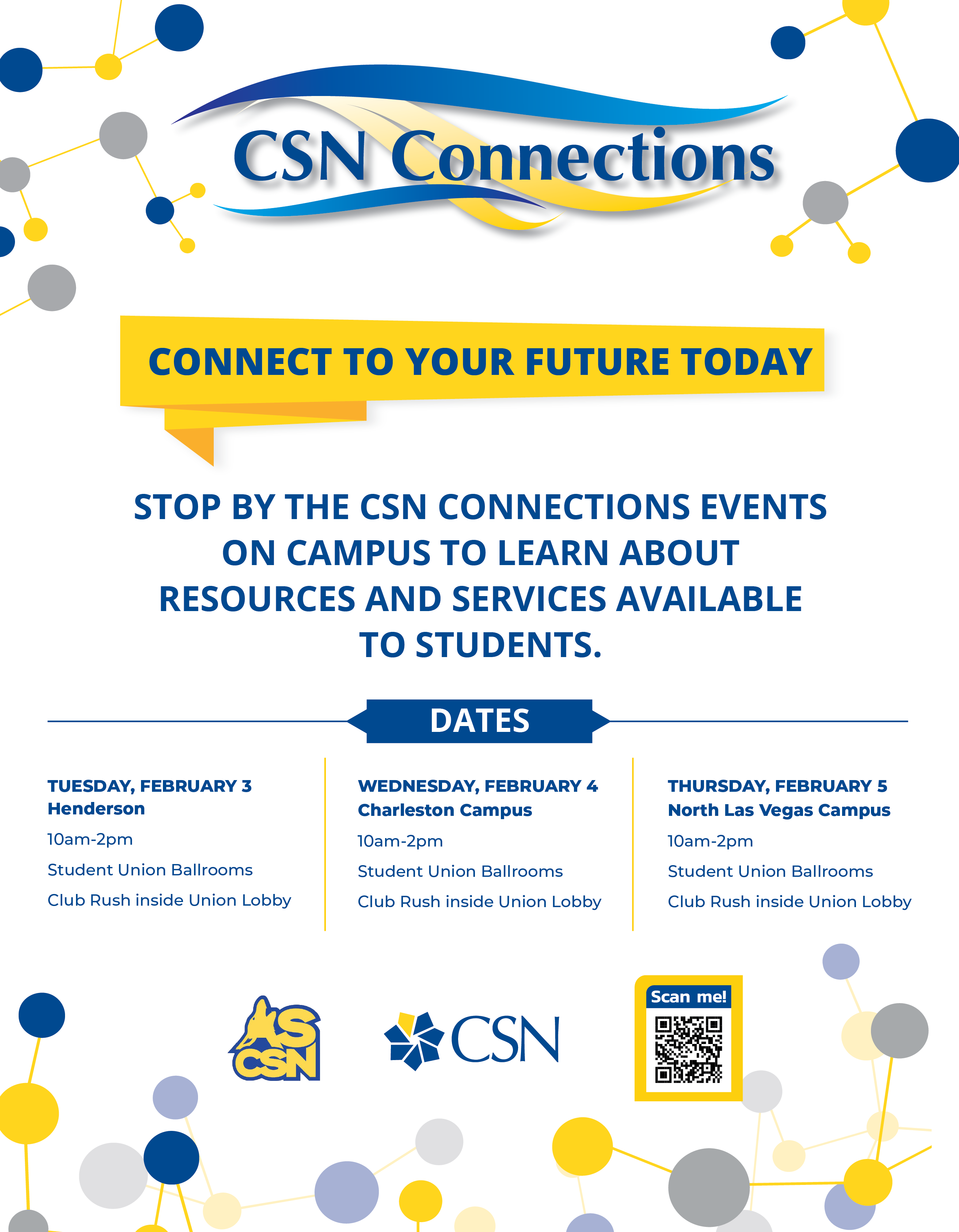 CSN Connections is a vibrant, campus-wide event that kicks off both the fall and spring semesters. Join fellow students to reconnect with friends, meet new people, visit your favorite faculty members, and enjoy great food. It’s also the perfect chance to rediscover the many valuable resources and services available across CSN’s campuses—especially those you may have forgotten since orientation. Come for the community, stay for the experience!