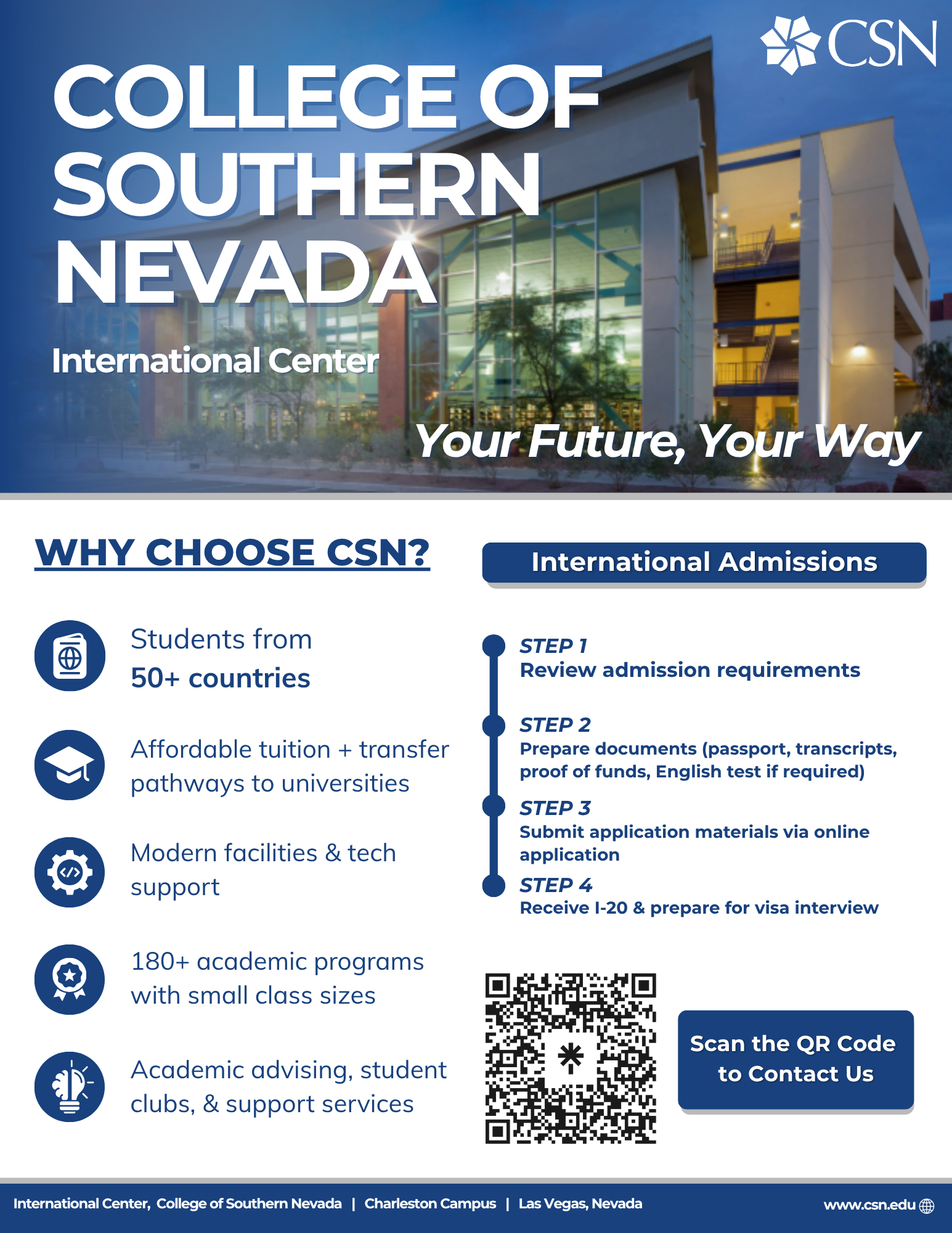 Welcome to CSN's International Recruitment Partner PortalJoin us in bringing quality education to students worldwide.Why Partner with CSN?The College of Southern Nevada (CSN) is the largest higher education institution in Nevada, offering over 180 degree and certificate programs. We are proud to work with trusted educational agencies to expand access to quality education in the U.S.Partner Benefits:Diverse academic programs and affordable tuitionDedicated support for international studentsReliable communication and collaboration with our International CenterPartnership RequirementsTo ensure a professional and ethical partnership, all agencies must:Be legally registered and authorized to operateFollow ethical recruitment standards as outlined by NACAC and NAFSASubmit a completed agency application formProvide a reference from U.S. institutions or partnersHow to ApplyStep 1: Complete the Agency Interest FormStep 2: Our team will review your application and contact you for next steps**Processing time is typically 2–3 weeksMarketing ResourcesWe offer the following materials to support your recruitment efforts:Downloadable brochures and flyersCSN promotional videosCSN Campus TourEngineering at CSNAlumni Spotlight: Experiences that InspireCSN Info Session: Flexible Classes & Career OptionsCSN Academic Program and Tuition BrochureRequest Additional Materials → Contact UsWebinar Resources:College of Southern Nevada 웨비나This webinar features an introduction to the College of Southern Nevada's baseball program and highlights opportunities for Korean student-athletes.Special guests include the CSN Baseball Head Coach, Athletic Advisor, International Advisors, and a partnering agency from South Korea.Learn how to support Korean students interested in playing baseball while studying at CSN.Watch the Webinar on YouTubeContact UsEmail: inquiry.ic@csn.eduPhone: +1(702)651-5820Website: https://www.csn.edu/education-and-training/ic-studentsSOCIAL MEDIA CSNInternationalStudents @csninternationalstudentsFrequently Asked Questions 1. Programs & Academics Q: What programs are most popular among international students?A: Business, Hospitality Management, Computer Science, Nursing, and ESL Pathway Programs.Q: Do you offer STEM-designated programs?A: NoQ: Are pathway or language support programs available?A: Yes, we offer ESL and Pathway programs. 2. Admissions & Requirements Q: What is the minimum English proficiency score?A: We accept TOEFL iBT 52, IELTS 4.5, Duolingo 80.Q: Do you offer conditional admission for students below the minimum English score?A: Yes, students need to take ESL courses first. Q: What documents are required for application?A: Online application, transcripts/High school diploma, passport copy, proof of English, bank statement, and sponsor letter.Q: What is the application fee?A: $25 3. Application Deadlines & Processing Q: When are the deadlines?A: Fall: July 1 / Spring: November 15 / Summer: April 15Q: How long does it take to process an application?A: Usually 1 to 2 weeks after receiving complete documents. 4. Tuition, Scholarships & Fees Q: What is the annual tuition?A: Approx. $13,500 per yearQ: Are there scholarships or discounts?A: YesQ: What is the estimated total cost of attendance?A: Approx. $25,800 including tuition, housing, meals, insurance. 5. Visa & Immigration Q: Do you help with the visa process?A: Yes, we provide I-20s and visa guidance.Q: Can students transfer from another U.S. school?A: Yes, we accept transfer students with valid F-1 status. 6. Housing & Student Life Q: Is housing available?A: Off-campus housing resources provided.Q: What support services do you offer?A: Academic advising, tutoring, international student orientation, cultural activities.Q: Are there clubs or organizations for international students?A: Yes, including International Student Organization (ISO) 7. Work & Internships Q: Can international students work?A: F-1 students may work up to 20 hours/week on campus. CPT and OPT are available for eligible students.Q: Do you help with internships and career placement?A: Yes, through our Career Services. 8. Agent Partnership Q: Do you pay commission?A: YesQ: Can we get marketing materials?A: Yes — brochures, digital flyers, social media posts, and videos are available upon request.