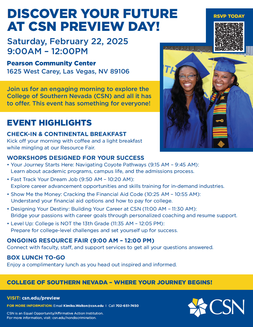 CSN Preview offers insight into the CSN admissions process. During Preview, you can expect to learn more about: