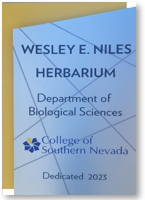 The Wesley E. Niles Herbarium is a collection of dried, pressed plant specimens mounted on archival quality sheets of paper, placed in folders, and stored in cabinets. The collection was relocated to the College of Southern Nevada Henderson Campus to continue to provide access to this invaluable resource to researchers, government agencies, and educators. Another mission of the collection is to inspire future generations of scientists to explore botany and climate change and how the two are interconnected.